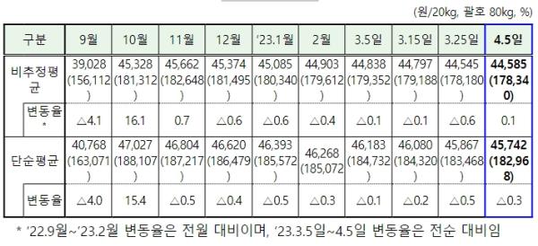 통계청 조사에 따르면, 4.5일자 산지쌀값은 비추정평균 기준 전순 대비 0.1% 상승한 44,585원/20kg 수준이며, 통계 개편 전 추정방식인 단순평균 기준으로는 45,742원/20kg이다.