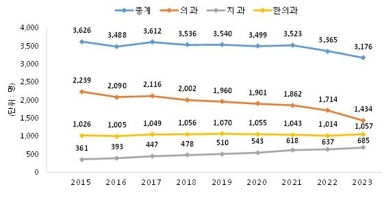 분야별로는 의과가 279명 감소했고, 치과 및 한의과는 각각 48명, 47명이 증가했다.