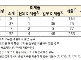 상급단체별로 보면, 한국노총의 미제출 비율은 4.7%(8개), 미가맹 등은 8.3%(7개)인데 반해 민주노총 소속 노동조합의 미제출 비율이 59.7%(37개)에 달해 한국노총에 비해 12배 이상 높은 것으로 나타났다. 이는, 한국노총의 경우 총연맹의 자료제출 거부 지침에도 불구하고 95.3%(164개)의 노동조합이 자료를 제출한 데 따른 것으로 보인다.