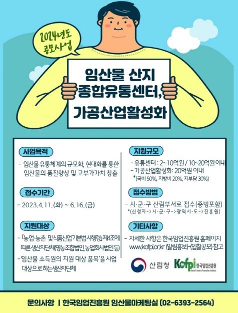 이번 공모는 ?산지종합유통센터(40억 원), ?가공산업 활성화(20억 원), ?임산물 협력 단지(클러스터)(20억 원), ?100대 명산?지리적표시 등록 임산물 명품화(20억 원) 등 4개 사업이며, 총사업비가 100억 원에 이른다.