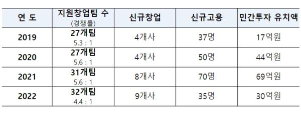 지난해에는 배양생선 기술을 개발하고 생산하는 ‘바오밥헬스케어’가 투자유치 전략 관련 멘토링과 기업설명회(IR) 행사를 통해 총 3억 원의 투자유치에 성공했고, 수산생물의 성장이나 번식에 피해를 주는 해적생물을 활용한 스판덱스와 의류를 제작하는 ‘주식회사 쿨베어스’는 판로개척, 맞춤형 멘토링을 통해 4억 원의 투자유치와 동시에 대형 쇼핑몰 거래 계약을 성사시키며 관심을 모았다.