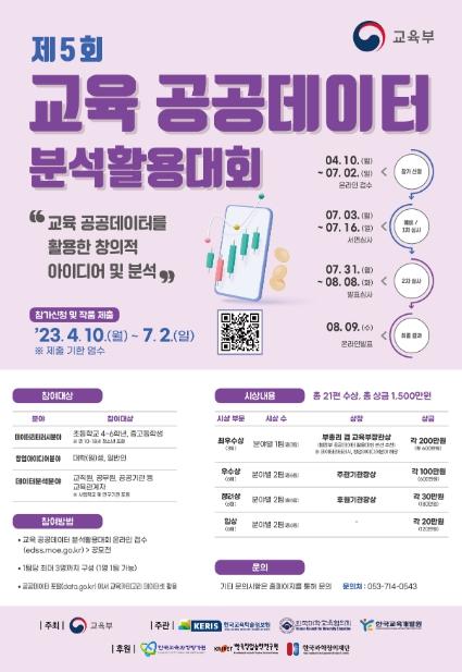 [한국뉴스타임=편집국] 교육부는 한국교육학술정보원(원장 서유미), 한국대학교육협의회(회장 장제국), 한국교육개발원(원장 류방란)과 함께 ‘교육 공공데이터를 활용한 창의적 아이디어 및 분석’을 주제로 제5회 교육 공공데이터 분석?활용대회를 개최한다.