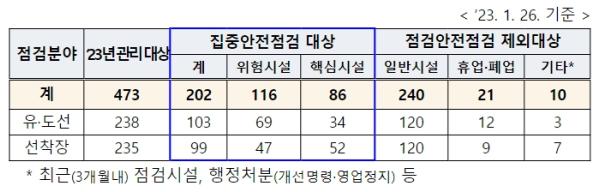 이번 점검은 범정부'대한민국 안전 대(大) 전환*' 캠페인 일환으로 코로나19 방역 수칙 완화 이후 야외활동 증가로 다중이용시설 이용객 증가에 따라 사회 전반에 대한 안전 위해요인을 찾아 △현장 시정 △보수보강 △정밀안전진단 △긴급안전조치 △사후관리 등의 후속 조치를 할 예정이다.