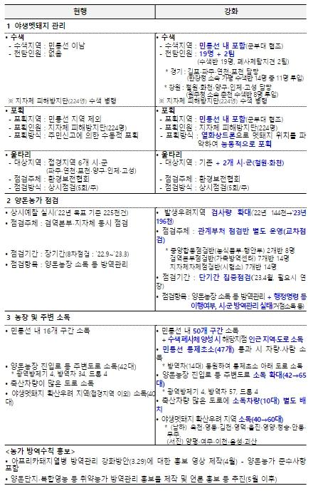 농식품부는 야생멧돼지의 이동 가능성이 있는 민통선 내의 도로에 대해 소독 구간을 확대(16 → 50개)하여 오염원을 선제적으로 소독·제거하고, 10개 시·군 내 가축·분뇨 운송 등 축산차량 통행량이 많은 도로(43번 국도 등)는 소독차량 3대를 별도로 배치하여 집중 소독한다.