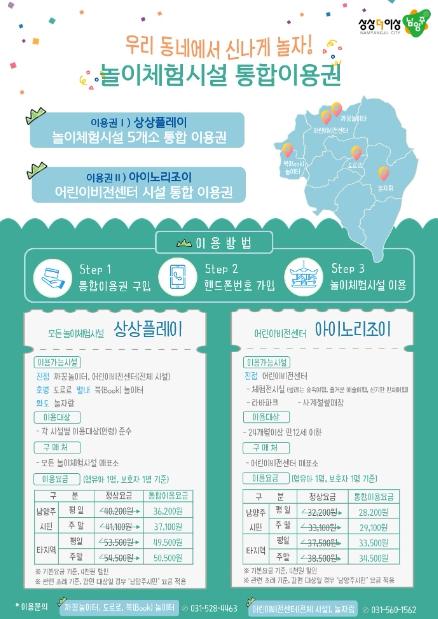 이번 통합 이용권은 시설마다 이용 건별 개별 요금을 결제하는 기존의 방식에 다중 이용 및 남양주 시민 등 감면 혜택을 적용해 한 번의 선결제로 모든 놀이체험시설을 이용할 수 있도록 시설 간 이용권을 결합한 것으로, 상상플레이와 아이노리조이 2종으로 구분된다.