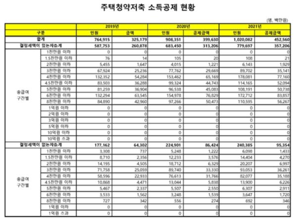 그 결과 , 최근 3 년간 주택청약저축 소득공제 혜택을 받은 근로자는 2019 년 ( 과세연도 기준 ) 76 만 4,915 명 , 2020 년 90 만 8,351 명 , 2021 년 102 만 82 명으로 해마다 10 만명 이상 늘었으며 , 소득공제액도 2019 년 3,251 억 7,900 만원 , 2020 년 3,996 억 3,000 만원 , 2021 년 4,525 억 6000 만원으로 증가했다 .( 국세청 자료 )
