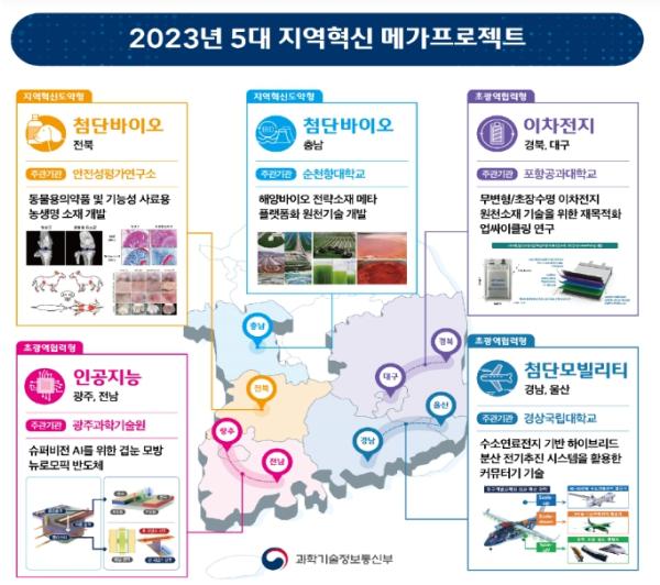 [한국뉴스타임=편집국] 과학기술정보통신부는 지역의 중장기 혁신에 필요한 원천기술 개발 및 지역산업?경제로의 확산을 촉진하는 ‘지역혁신 메가프로젝트 사업’에 경북?대구(이차전지), 경남?울산(첨단모빌리티), 광주?전남(인공지능), 충남, 전북(첨단바이오)에서 수행하는 5개 프로젝트를 신규 선정했다고 밝혔다.