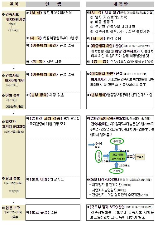또한, 허가권자와 대한건축사협회가 건축사보 배치현황을 확인하여 이중배치 여부를 검증할 수 있도록 주체별 역할을 명확히 규정하고, 감리원 배치현황 제출 등의 업무절차를 건축행정시스템(세움터)과 연계하여 전산화한다.