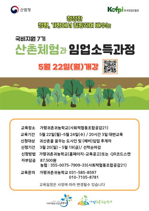 산촌체험과정(산촌체험과 임업소득과정) 참여자를 공개 모집하며, 신청은 학교 홈피(https://gpreturn.modoo.at/) 및 전화신청이 가능하다.