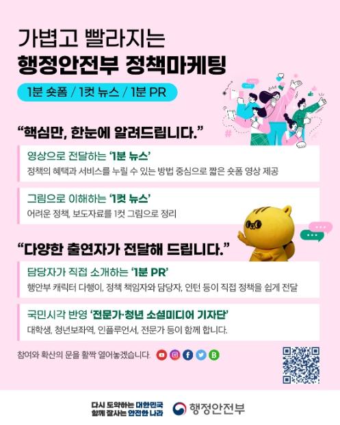 행정안전부는 짧고 재미있는 콘텐츠를 선호하는 최근 경향에 맞추어 숏폼 형태의 '1분 뉴스'와 그래픽형 보도자료인 ‘1컷 뉴스’ 제작 강화를 통해 빠르고 쉽게 정책 내용을 전달하는 등 세대별 특성에 맞는 맞춤형 콘텐츠를 지속적으로 선보일 계획이다.