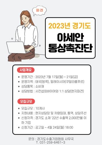 ‘2023년 경기도 아세안 통상촉진단’은 7월 17일부터 21일까지 5일 동안 태국 방콕과 말레이시아 쿠알라룸푸르를 방문해 1:1 수출상담회를 통해 신규 구매자(바이어) 발굴에 나선다.