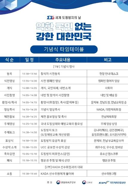 [한국뉴스타임=편집국] 문화체육관광부는 한국도핑방지위원회(위원장 이영희)와 함께 4월 14일 오후 2시, 전남 남악스카이컨벤션에서 ‘약한 국민없는 강한 대한민국’을 주제로 ‘2023 세계도핑방지의 날(Play True Day) 기념식’을 개최한다. 이번 기념식에서는 ‘2023 목포 전국체전(10. 13.~19.)’과 연계하여 공정한 대회 개최와 생활 속 스포츠 가치 확산을 홍보한다.