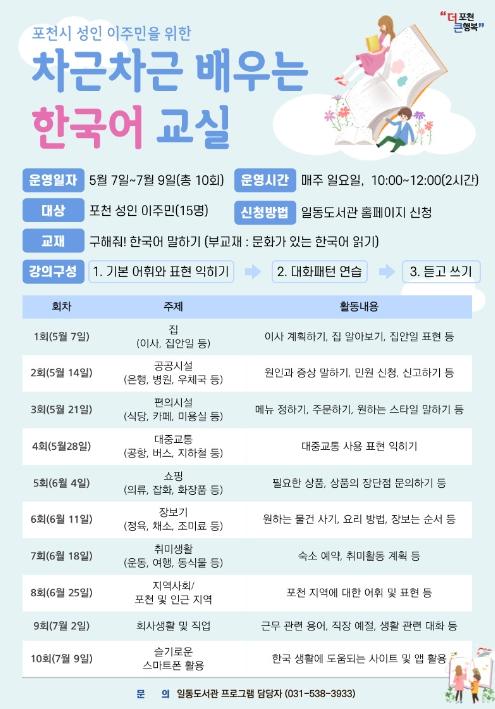 [한국뉴스타임=편집국] 포천시 일동도서관은 관내 거주 성인 이주민의 안정적인 한국 생활을 돕고자 한국어 능력 향상을 위한 ‘차근차근 배우는 한국어 교실’을 운영한다.