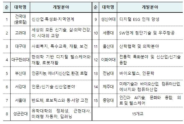 무크선도대학에는 강점·특화 분야 및 신기술·신산업 수요 분야의 개발역량 등이 풍부한 15개교가 최종 선정됐다.