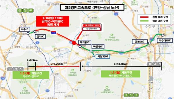 [한국뉴스타임=편집국] 국토교통부는 방음터널 화재사고로 그간 통행이 제한됐던 제2경인고속도로 삼막IC~북의왕IC, 7.26km 구간의 통행이 4월 16일 오후 5시부터 재개된다고 밝혔다.