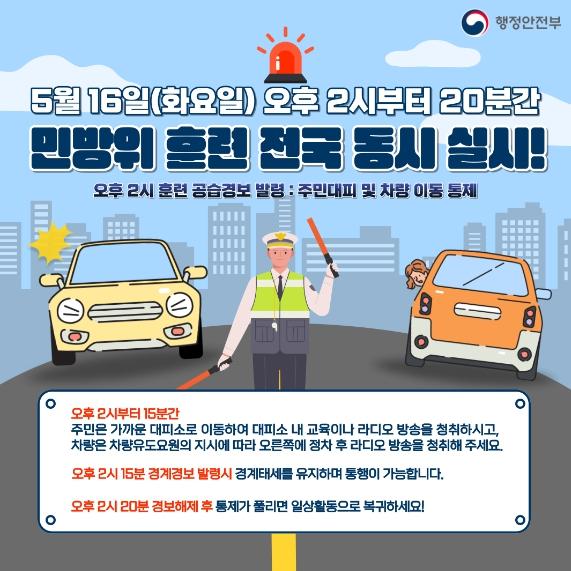 [한국뉴스타임=편집국] 행정안전부는 북한의 미사일 도발, 러시아-우크라이나 전쟁 등 한반도의 안보 위협이 고조됨에 따라 비상시 국가 대응 역량을 강화하기 위해 오는 5월 16일 오후 2시부터 20분간 민방위훈련을 전국 동시에 실시한다고 밝혔다.