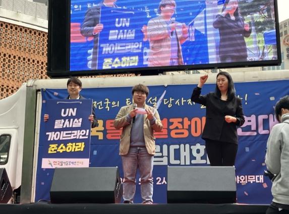 이날 전국탈시설장애인연대 창립대회를 위해 모인 장애인들은 ‘탈시설 과정에 당사자 참여를 보장하라!’ ‘UN 탈시설 가이드라인 준수하라!’ 등 구호를 외치며 탈시설을 위한 장애인들의 연대와 의지를 드러냈다.