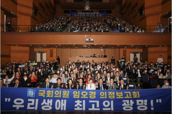 ‘우리 생애 최고의 광명! 임오경의 바람이 분다!’라는 슬로건으로 코로나 팬데믹 이후 처음으로 열린 이번 의정보고회에는 광명시민, 당원 및 각계 인사들이 참석해 광명시민회관 1·2층과 로비를 가득 메웠다.
