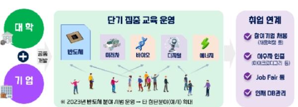 ‘첨단산업 인재양성 부트캠프’는 다양한 배경의 학생들이 대학과 기업이 공동 운영하는 1년 이내 집중교육을 통해 반도체 등 첨단분야 기업에 취업할 수 있도록 기획된 신규 사업이다. 올해 10개 대학(대학 5개교, 전문대학 5개교)을 선정하여 향후 5년간 사업 운영을 위한 총 150억 원의 재정지원을 하게 된다.