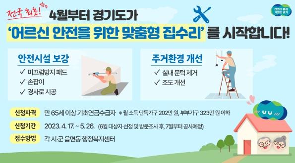 이번 사업은 김동연 경기도지사의 공약사업으로 만 65세 이상 기초연금 수급자가 낙상 등의 주택 내 사고를 예방하면서 안전하게 거주할 수 있도록 노인 친화적인 주택 개조를 지원하는 사업이다. 미끄럼방지 패드와 경사로 등 주택 내 안전시설을 설치·보강하고, 실내 조명을 밝게 만들고 문턱을 없애는 등 주거환경 개선을 지원한다. 총 200호를 대상으로 호당 최대 500만 원 상당을 지원한다.