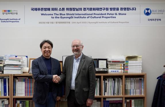 경기문화재연구원(원장: 이지훈)은 국제 푸른방패피터 스톤 위원장(Peter G. Stone)이 연구원을 방문, 문화유산보호를 위한 국제적 협력 방안에 대해 논의했다고 밝혔다. 피터스톤 위원장의 한국 방문은 이번이 2번째로 3일간의 짧은 일정 속에서 유네스코 세계유산 국제해석설명센터 방문과 경기문화재연구원 방문이 전격적으로 이루어졌다.
