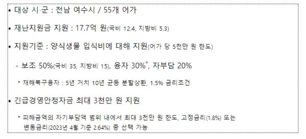 이번 재난지원금은 올해 1~3월 중 전라남도 여수지역에서 저수온으로 피해를 입은 어류(돔류, 조기류) 양식어가에 지원한다. 또한, 재난지원금과 더불어 재해 복구를 위한 융자자금(재해복구자금, 이자차액보전)과 긴급경영안정자금도 지원한다. 해당어가의 피해 정도에 따라 사용 중인 어업경영자금의 상환은 최대 2년까지 유예할 수 있고, 이자도 감면해준다.