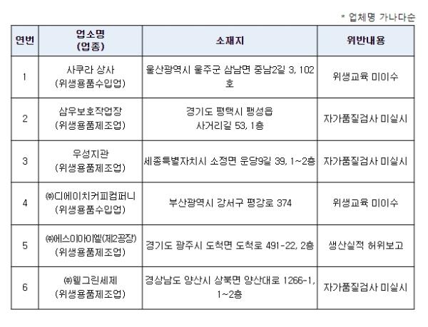 점검 결과 주요 위반 내용은 ▲자가품질검사 미실시(3건) ▲위생교육 미이수(2건) ▲생산실적 허위보고(1건)이며, 이번에 적발된 업체는 관할관청에서 행정처분 등의 조치 후 6개월 이내에 다시 점검하여 개선 여부를 확인할 예정입니다.