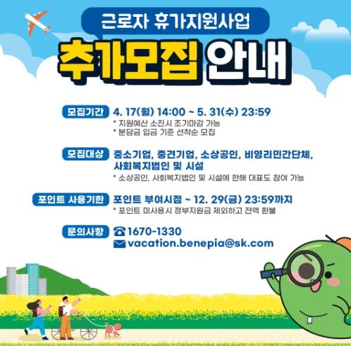 [한국뉴스타임=편집국] 문화체육관광부는 한국관광공사와 함께 4월 17일부터 5월 31일까지 ‘근로자 휴가 지원 사업’에 참여할 기업과 근로자를 추가로 모집한다.