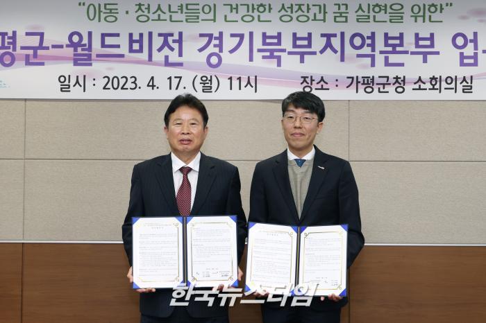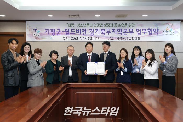 [한국뉴스타임=편집국] 가평군은 아동 및 청소년들의 건강한 성장과 꿈 실현을 위해 17일 군청 소회의실에서 월드비전 경기북부지역본부간 업무 협약식을 가졌다.