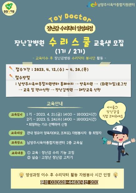 ‘장난감 수리스쿨’은 영유아 가정의 부모 또는 조부모 등 양육자를 대상으로 고장 난 장난감을 직접 고칠 수 있는 기본 기술을 교육하는 프로그램으로, 남양주시 장난감도서관을 위탁 운영 중인 남양주시육아종합지원센터와 지역 내 기업인 장난감발전소가 공동 기획했다.