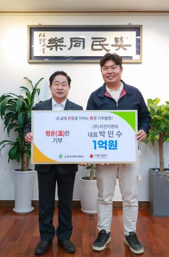 [한국뉴스타임=편집국] ㈜서진이엔씨 박민수 대표는 17일 남양주시 내 취약계층을 지원하기 위해 1억 원 기부를 약정하며, 남양주시복지재단의 평생 기부 프로그램 ‘평온(溫)한 기부’에 동참했다.