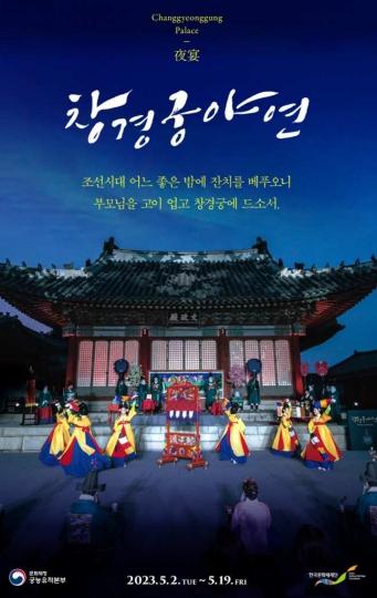 [한국뉴스타임=편집국] 문화재청 궁능유적본부(본부장 정성조)는 한국문화재재단(이사장 최영창)과 함께 ‘효심’을 주제로 관람객과 함께 하는 참여 프로그램인 '2023년 창경궁 야연(夜宴)'행사를 5월 2일부터 19일까지 창경궁 문정전(서울시 종로구)에서 개최하기로 하고, 오는 4월 19일 오후 2시부터 온라인 선착순으로 예매를 시작한다.