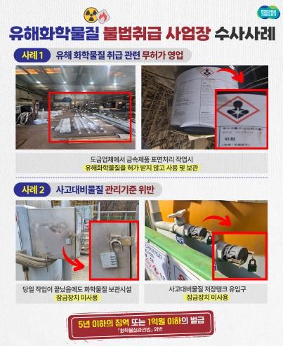 주요 적발 사례를 보면 시흥시 소재 ‘A’ 업체는 2020년 6월부터 2023년 3월 24일까지 2년 9개월 동안 금속제품의 표면처리작업 시 무수크롬산, 수산화나트륨 등을 관할관청의 허가를 받지 않고 사용하다 적발됐다. 무수크롬산, 수산화나트륨과 같이 강한 독성을 가진 화학물질은 화학사고를 유발할 수 있는 유독물질로 지정됐다.