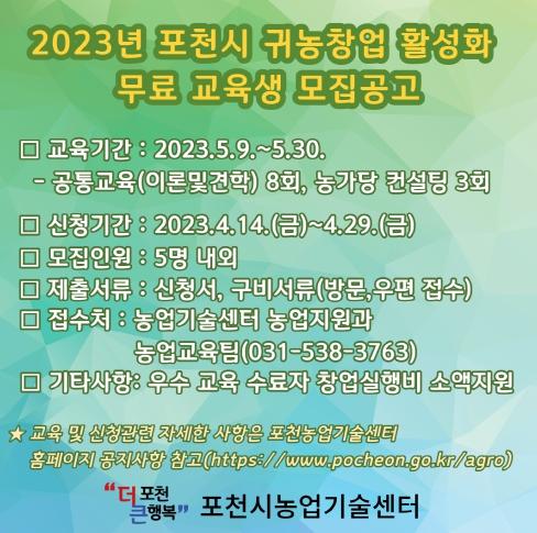 [한국뉴스타임=편집국] 포천시농업기술센터는 오는 4월 28일까지 2023년 귀농창업 활성화 지원’컨설팅 교육생을 모집한다.