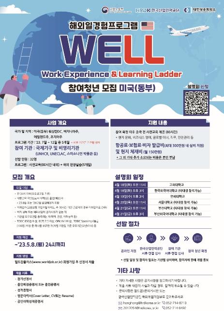 [한국뉴스타임=편집국] 한국산업인력공단은 대한상공회의소와 함께 청년의 글로벌 직무역량 강화를 위한 ‘2023년 해외 일경험(‘WELL’) 프로그램’을 개시한다.