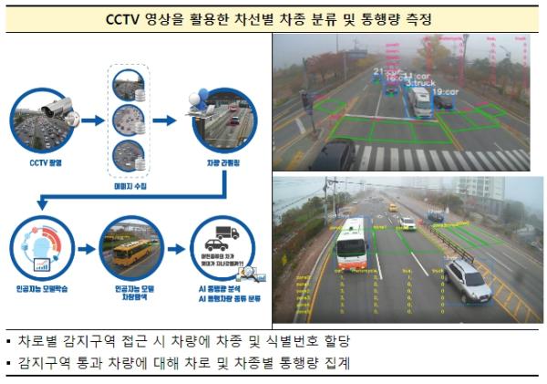이번에 개발된 모델은 CCTV를 통해 확보된 영상을 인공지능(AI)이 도로교통량조사 기준인 12종으로 자동분류하고, 차량이 통과하는 차선위치를 파악하여 차선?차종별 통행량을 집계하게 된다.