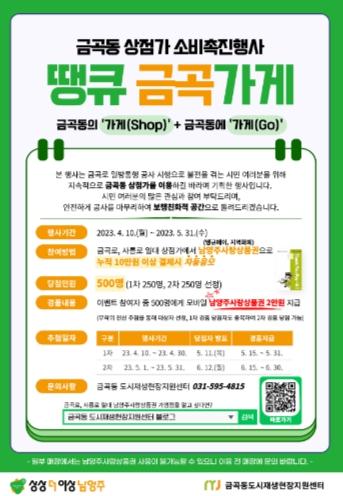 이번 행사는 금곡로와 사릉로 일원의 남양주사랑상품권 가맹점에서 10만 원 이상 소비하는 경우 자동 응모되며, 무작위 추첨을 통해 1차(4월 10일~4월 30일)와 2차(5월 1일부터 5월 31일)에 회당 250명씩 총 500명에게 남양주사랑상품권 2만 원이 지급된다.