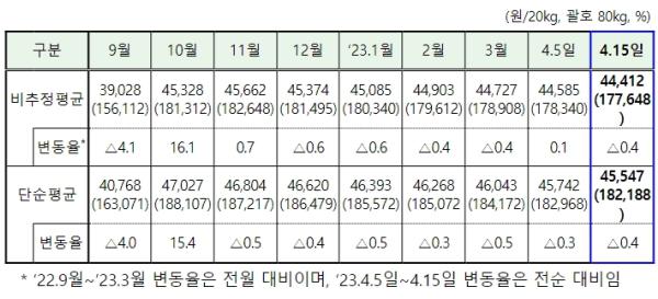 통계청 조사에 따르면, 4.15일자 산지쌀값은 비추정평균 기준 전순 대비 0.4% 하락한 44,412원/20kg 수준이며, 통계 개편 전 추정방식인 단순평균 기준으로는 45,547원/20kg이다.