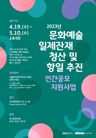 [한국뉴스타임=편집국] 경기도와 경기문화재단(대표이사 유인택)은 일제강점기 왜곡된 문화잔재를 발굴하고 청산하고 역사인식을 고취하기 위해 항일 문화·예술 콘텐츠를 지원하는 '문화예술 일제잔재 청산 및 항일 추진 민간공모 지원사업'을 시행한다.