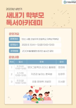 경기평생교육학습관(관장 윤재철)이 안산·시흥·안성지역 초등학교 저학년 학부모를 대상으로 ‘새내기 학부모 독서아카데미’를 운영한다.