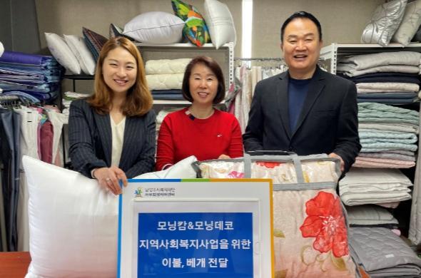 [한국뉴스타임=편집국] 모닝캄과 모닝데코는 지난 18일 남양주시 서부희망케어센터에 1,800만 원 상당의 이불과 베개 약 150개 세트를 기탁했다.