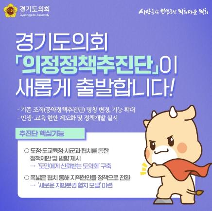 한편, 경기도의회는 지난해 11월 1일 ‘경기도의회 기본 조례’ 제1조(목적) 및 제6조(의회의 역할)에 근거해 염 의장 취임공약에 기반한 의정지원 조직인 ‘공약정책추진단’을 구성했다.