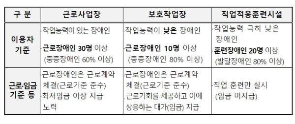 장애인직업재활시설은 일반 작업환경에서 일하기 어려운 장애인이 특별히 준비된 작업환경에서 직업훈련을 받거나 직업 활동을 할 수 있도록 하는 시설로, 근로사업장, 보호작업장, 직업적응훈련시설 등 3가지 시설유형이 있다.