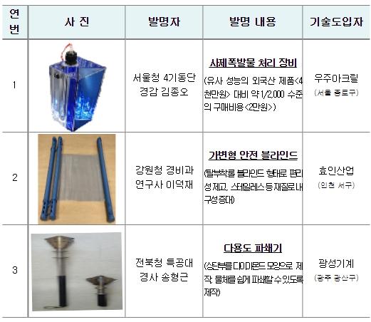 경찰청 과학치안산업팀장(류연수)은 “?사제폭발물 처리 장비?는 국내 기업에서 생산할 경우, 외국산 고가의 제품을 대신할 수 있을 것으로 기대되며, ?다용도 파쇄기?는 현장 경찰관이 건물이나 차량 내부로 신속히 진입할 수 있도록 돕고, ?가변형 안전 블라인드?는 차량 운전자들을 보호하는데 활용될 수 있을 것으로 기대된다.”라고 밝혔다.