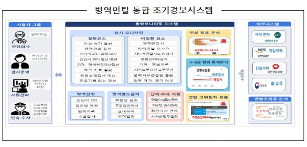 병역면탈 의심자 데이터 추적관리를 고도화하여 병역이행 단계별?질병별?의사별?지역별 이상 징후를 분석하고 4~6급 판정자의 자격?면허 취득 정보, 범죄이력 등을 종합하여 면탈 의심자를 색출하는 병역면탈 통합 조기경보시스템을 구축한다.