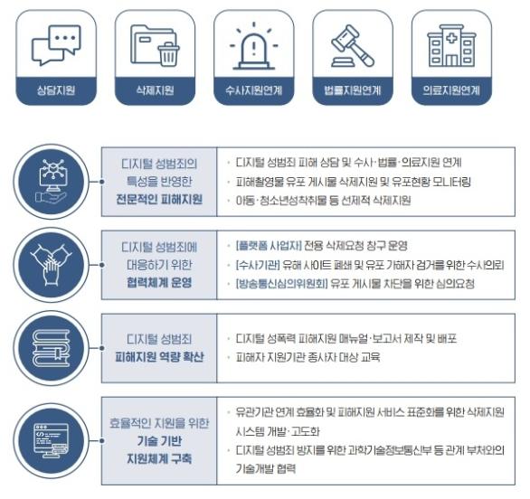 여성가족부는 ‘5대 폭력(권력형성범죄, 디지털성범죄, 가정폭력, 교제폭력, 스토킹범죄) 피해자 보호?지원 강화’를 국정과제로 추진하고 있으며, 디성센터를 중심으로 디지털 성범죄 피해자의 회복을 지원하고 있다.