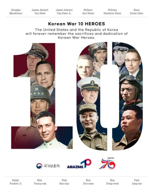 한·미 참전용사 10대 영웅에는 맥아더 유엔군 총사령관, 밴 플리트 부자(父子), 윌리엄 쇼 부자(父子), 딘 헤스 공군 대령, 랄프 퍼켓 주니어 육군 대령, 김영옥 미국 육군 대령, 백선엽 육군 대장, 김두만 공군 대장, 김동석 육군 대령, 박정모 해병대 대령이 이름을 올렸다.