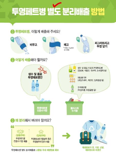 ‘투명페트병 별도 분리배출제’는 무색·투명한 생수 및 음료 페트병을 일반 플라스틱 및 유색 페트병과 구분하여 별도로 분리 배출하는 제도이다. 별도 분리배출된 투명페트병은 의류를 만드는 장섬유, 화장품 용기, 페트병 등 가치가 높은 제품 소재로 다시 활용된다.