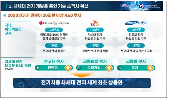 국내 전지 3사는 최첨단 제품 생산과 기술?공정의 혁신이 이루어지는 마더팩토리를 국내에 구축한다. 3사 모두 전고체 전지 시제품 생산 공장을 국내에 구축할 예정이며, 원통형 4680 전지, 코발트프리 전지 등도 국내에서 생산을 개시해 해외에서 양산할 계획이다. 정부는 차세대 전지 개발을 위한 대규모 R&D를 추진할 계획으로, 전고체 전지(안전성↑), 리튬메탈 전지(주행거리↑), 리튬황 전지(무게↓) 등 유망 이차전지가 포함될 예정이다. 이를 통해 기업과 정부는 세계 최초로 차량용 전고체 전지 양산기술을 확보한다는 전략이다.