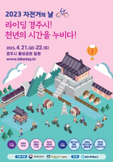 행정안전부와 경주시는 자전거의 날을 맞아 4월 21일부터 4월 22일까지 이틀간 2023 자전거의 날 행사를 개최한다고 밝혔다.